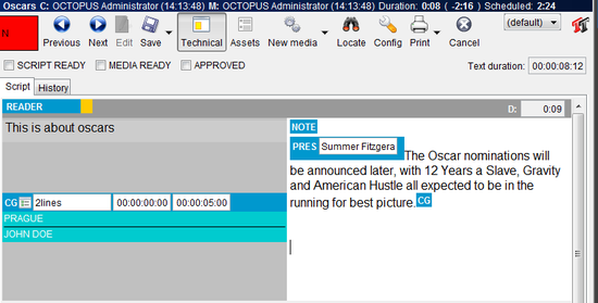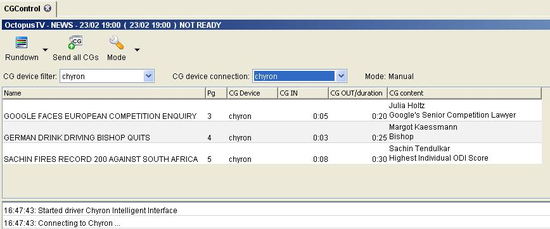 There are two ways that OCTOPUS can be integrated with CG devices, either via MOS or by using CG Control (this chapter covers only CG Control) with Chyron or Aston drivers to send CG's via a serial connection to the CG device. The CG control interface sends the text entered in CG's in OCTOPUS stories along with a template number to the CG device. The CG device will then add the text to the matching template and render it. Whenever changes are made to an OCTOPUS rundown, these can be automatically sent to the CG device via CG control.