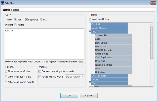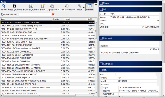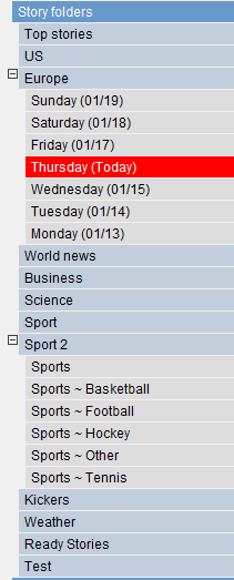 All messages from wire agencies are located under the WIRES option on the main menu. Wires are automatically filtered into folders according to their source agency, topic, priority or category. This folder structure can be customised by your administrator. Attachments sent by the agencies such as JPEG files can also be received and displayed in OCTOPUS. In addition to wires from the agencies, RSS messages and incoming emails can be received and shown in OCTOPUS. These sources of information are presented in OCTOPUS like wires.