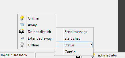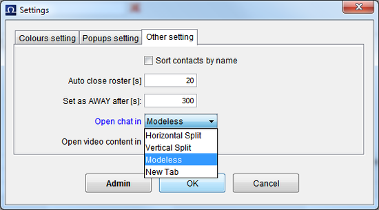 To access messaging set-up options click on the Contact list Menu and choose Config. Under Popup setting you may check a tickbox that allows showing popup windows for incoming message and times after which it is closed automatically. The Settings tab has a tickbox that allows sorting contacts alphabetically, the Auto Close Roster is a number of seconds after which the Contacts list will close, Set as Away after is a number of seconds of inactivity after which status will automatically be set to Away. The Open Chat In setting allows changing the way the chat opens, the options are either Horizontal Split, Vertical Split, New Tab or Modeless (A small separate window).