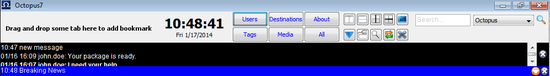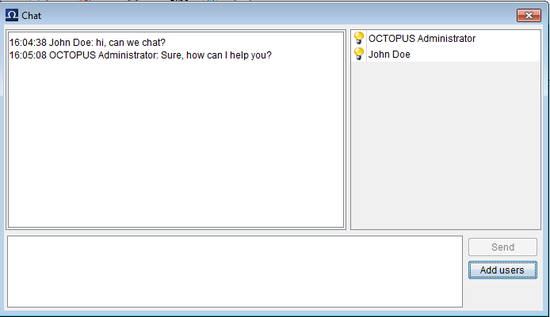 o start a chat, right click on a user or group in your contacts list and choose Start Chat from the menu. This will open a new chat window. The chat section in Octopus has three parts, the lower section is for typing the messages. The top right area displays a list of the users that have been invited to the chat. The upper left part of the chat shows all messages sent and received including the username of sender and time sent next to each message.
