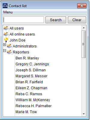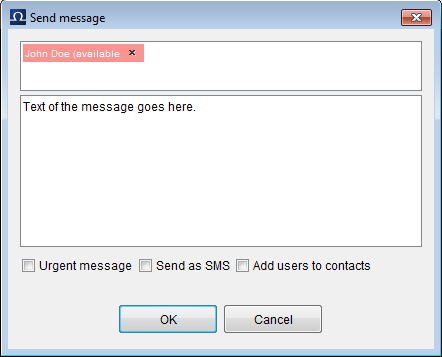 From the contact list window, right click on a contact name or group name and choose Send Message. You can add more message recipients for this message by either typing the start of their username into the top text entry box and then clicking on the matching user, or by clicking on the '…' button and making a selection from this multi-select list. Then just type the message into the lower text entry box (maximum 255 characters) and click the Send button. Optionally you can click the Urgent Message checkbox if this should be sent as an urgent message, or if you have the OCTOPUS SMS module available it is possible to click the Send as SMS checkbox to have the message forwarded to the users mobile via SMS. You can add the recipients to your contacts list by ticking the Add to Contacts tickbox.