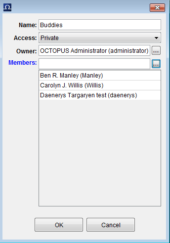 Right clicking on a group in the contacts window will display a menu with two options; Send Message and Start Chat. Send message sends an instant message to all users in the group, Start chat sends an invitation to join a chat to all users in the group and opens a chat section with group members added. To expand or hide the contents of user groups in your contacts list, double click on the group name in the contact list. User rights groups can be configured by your administrators to be displayed as messaging groups as well so you may see these available for selection in your contacts list. You can also create messaging groups yourself, this option should be available in the main menu under My Octopus/User Groups. In this section you can click the New button to create a new user group, type the name for your group into the Name field. You can choose whether you want other users to see/modify the group by choosing the Access, the options are Private (only you can see the group), Public Read-Only (Other users can see the group) or Publicly Modifiable (other users can make changes to the group). The Owner field allows administrators to change who can modify a Public Read Only group, typically you can leave this as your own user account which is the default. Adding members to the group can be done by typing a few letters from the users name into the Members field and then choosing from the available matches.