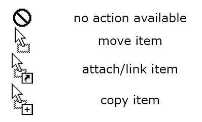 Drag and Drop with the Shift key pressed will move the item to its target, Ctrl pressed while dragging will copy the item, Ctrl and Shift pressed simultaneously assigns the item to another folder. The mouse pointer will also help you to recognise the type of an action that will be performed: