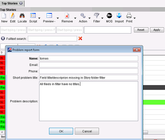 To open the tool, press Ctrl+Shift+F12. This will bring up the Problem report form where you can describe the problem. Once submitted, compressed client logs, screenshot and your description of the problem is uploaded to Octopus server to octopus\server\data directory under current month and date folders. Notify administrator about the report.