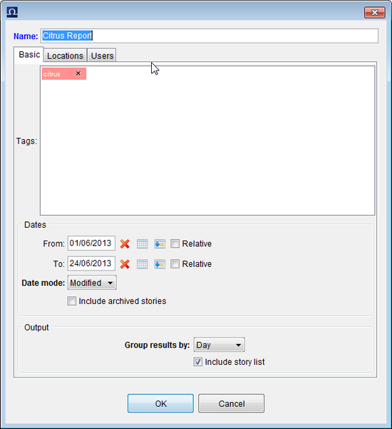 In Basic tab you can limit story set by tags and date range. If you check "Relative" checkbox next to dates, OCTOPUS will remember dates not as absolute dates but as offset to current date. If you, for instance, set dates corresponding last week on Monday, run on next Monday would process current week. If you archive aggresively, you might want to include archived stories - keep in mind such stories are no longer present in story folders (but they keep the link to rundown, if it was archived en bloc). In Output part you can select grouping you want, if you want to see amount of stories per day, choose day, if you would like to have stories broken down by user, select user etc. If you check "Include story list", names of individual stories will also be part of export.