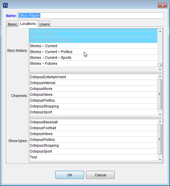 In Locations tab you can select story folders, channels and show types to be included in results. If you don't select anything, OCTOPUS will behave as if there was no filter (ie. processes all).