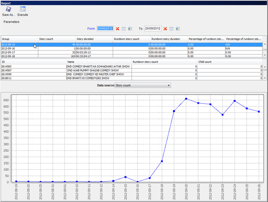 Reports allow users to export aggregate statistical data about stories and their usage in rundowns. You can set limits to channel(s), show type(s), user(s), tag(s), date range, etc. You can also group results by day, month, year, tag, user or group. As far as date range is concerned, this can be set for every report execution - you can keep reusing one report and only update date range every time.