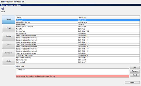 To change one of the shortcuts, select the action/shortcut in the list and then left click on box below that displays the current shortcut key combination for this action, now click the Remove button which will delete the current shortcut key combination. Next, click on the pink row at the bottom of this section with the message “Focus here and press the key combination to create the shortcut”, and press the desired key combination. Follow this procedure for each shortcut that needs to be changed and then click save on the toobar.