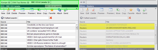 It is also possible to split the screen into multiple working areas. When you split the screen each split can contain different folders and multiple tabs, so for example you can be editing a story in one split, have the rundown open in another and be browsing multiple tabbed wire folders in the third.