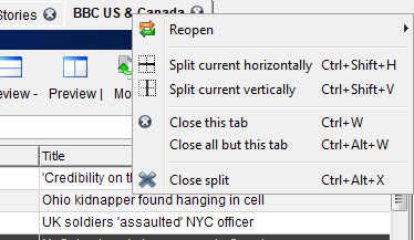 In Addition to the Desktop Actions toolbar, the following options related to each split are available by right clicking on the tab header: Reopen, Split Current horizontally, Split Current Vertically, Close this tab, Close all but this tab, Close Split.