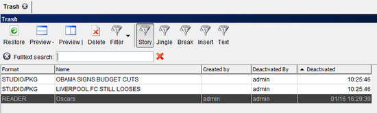 To restore a deleted story, select it from a list and press RESTORE button. You will then be presented with a list of containers, choose the one you would like to restore the item to and click the OK button. Double clicking on an item in the list will also start the restore action. You can select multiple items to restore using Ctrl/Shift +left click. Dragging and dropping stories to a container will also restore them.