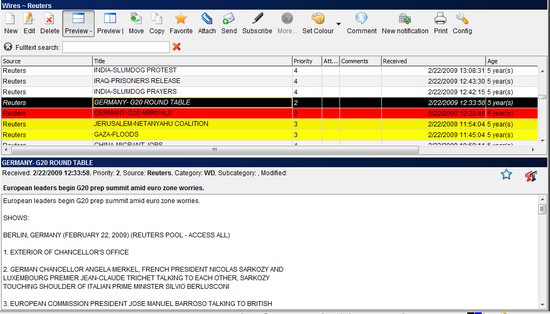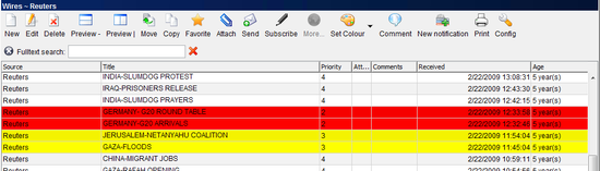 Wire messages of particular significance can be highlighted in configurable colours. For example FLASH wire messages, possibly those defined as a priority 1 or 2 by the news agency can be highlighted red in the list of wire messages. Any number of highlight colours can be defined by the administrator based on wire rules according to the priority, source, subject, keywords, category or subcategory. If you think that a wire message should be coloured and it is not, you can do so by clicking Set Colour button on the toolbar, or by right clicking on the wire in the list and choosing Set Colour from the context menu. The option to set colour can be restricted by user rights, as these highlight colours are seen by all users of the system once applied.