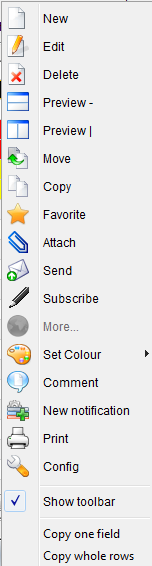 If there are more buttons than can fit the screen (usually when the screen is split horizontally) an will appear on the right of the toolbar. By clicking on this arrow the additional options will be displayed. If a button is greyed out, the option is unavailable. Toolbar actions can also be accessed from context menus that appear after right clicking one of the items in the list.